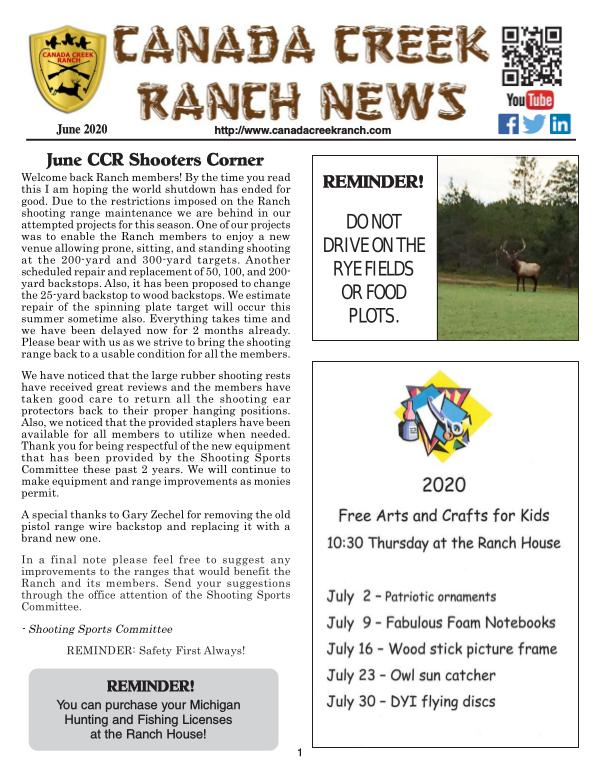 June 2020 http://www.canadacreekranch.com June CCR Shooters Corner Welcome back Ranch members! By the time you read this I am hoping the world shutdown has ended for good. Due to the restrictions imposed on the Ranch shooting range maintenance we are behind in our attempted projects for this season. One of our projects was to enable the Ranch members to enjoy a new venue allowing prone, sitting, and standing shooting at the 200-yard and 300-yard targets. Another scheduled repair and replacement of 50, 100, and 200- yard backstops. Also, it has been proposed to change the 25-yard backstop to wood backstops. We estimate repair of the spinning plate target will occur this summer sometime also. Everything takes time and we have been delayed now for 2 months already. Please bear with us as we strive to bring the shooting range back to a usable condition for all the members. We have noticed that the large rubber shooting rests have received great reviews and the members have taken good care to return all the shooting ear protectors back to their proper hanging positions. Also, we noticed that the provided staplers have been available for all members to utilize when needed. Thank you for being respectful of the new equipment that has been provided by the Shooting Sports Committee these past 2 years. We will continue to make equipment and range improvements as monies permit. REMINDER! DO NOT DRIVE ON THE RYE FIELDS OR FOOD PLOTS. A special thanks to Gary Zechel for removing the old pistol range wire backstop and replacing it with a brand new one. In a final note please feel free to suggest any improvements to the ranges that would benefit the Ranch and its members. Send your suggestions through the office attention of the Shooting Sports Committee. - Shooting Sports Committee REMINDER: Safety First Always! REMINDER! You can purchase your Michigan Hunting and Fishing Licenses at the Ranch House! 1