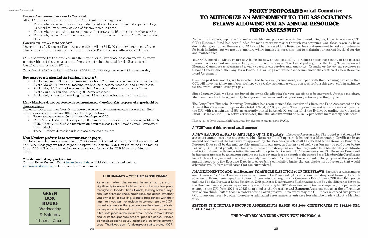 AN AMENDMENT TO ADD“ and Resource” TO ARTICLE X, SECTION 10 OF THE BYLAWS: Increase of Assessments and Entrance Fee. The Board may assess each owner of a Membership Certificate outstanding as of January 1 of each year, an additional sum equal to the annual percentage change in the Consumer Price Index( CPI) for Michigan as published by the Bureau of Labor Statistics, United States Department of Labor as measured by the difference between the third and second preceding calendar years,( for example, 2024 dues are computed by comparing the percentage change in the CPI from 2021 to 2022) as applied to the Operating and Resource Assessments, upon the affirmative vote of two-thirds( 2 / 3) of those members of the Board present. In no event may the CPI increase exceed five percent( 5 %) in any one year. No other increase or additional assessments or entrance fees shall be made without a Member vote.