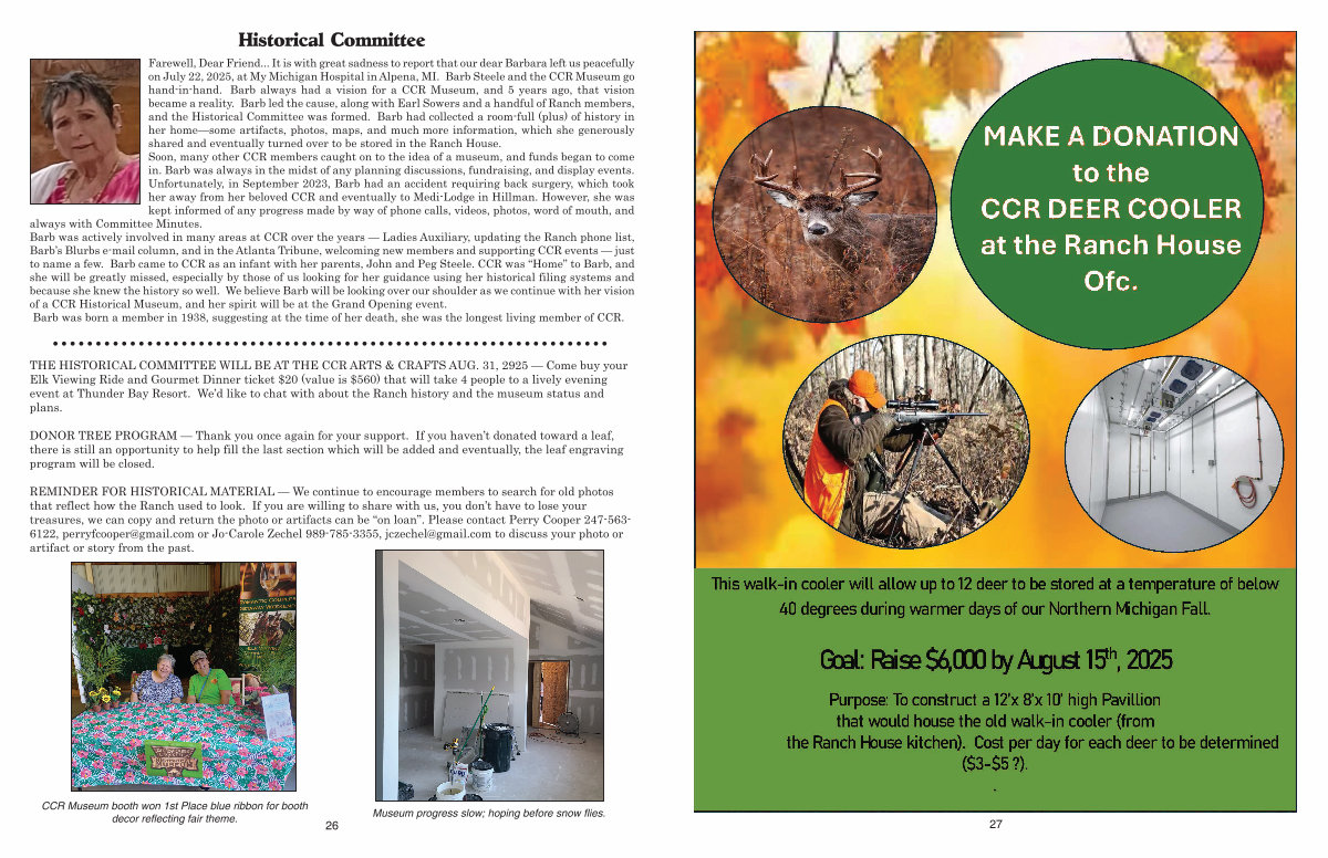 Farewell, Dear Friend... It is with great sadness to report that our dear Barbara left us peacefully on July 22, 2025, at My Michigan Hospital in Alpena, MI. Barb Steele and the CCR Museum go hand-in-hand. Barb always had a vision for a CCR Museum, and 5 years ago, that vision became a reality. Barb led the cause, along with Earl Sowers and a handful of Ranch members, and the Historical Committee was formed. Barb had collected a room-full( plus) of history in her home— some artifacts, photos, maps, and much more information, which she generously shared and eventually turned over to be stored in the Ranch House. Soon, many other CCR members caught on to the idea of a museum, and funds began to come in. Barb was always in the midst of any planning discussions, fundraising, and display events. Unfortunately, in September 2023, Barb had an accident requiring back surgery, which took her away from her beloved CCR and eventually to Medi-Lodge in Hillman. However, she was kept informed of any progress made by way of phone calls, videos, photos, word of mouth, and always with Committee Minutes. Barb was actively involved in many areas at CCR over the years— Ladies Auxiliary, updating the Ranch phone list, Barb’ s Blurbs e-mail column, and in the Atlanta Tribune, welcoming new members and supporting CCR events— just to name a few. Barb came to CCR as an infant with her parents, John and Peg Steele. CCR was“ Home” to Barb, and she will be greatly missed, especially by those of us looking for her guidance using her historical filing systems and because she knew the history so well. We believe Barb will be looking over our shoulder as we continue with her vision of a CCR Historical Museum, and her spirit will be at the Grand Opening event. Barb was born a member in 1938, suggesting at the time of her death, she was the longest living member of CCR.