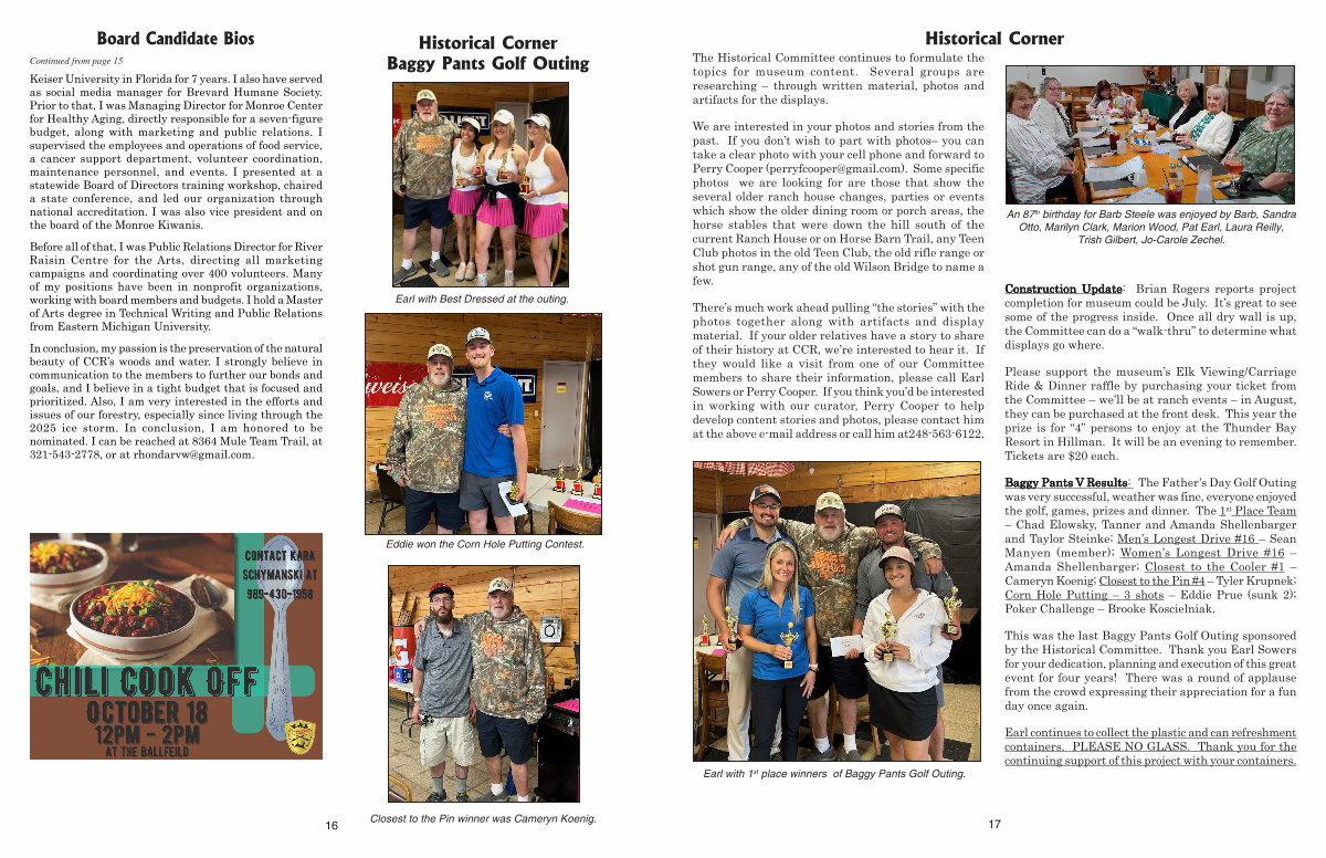 In conclusion, my passion is the preservation of the natural beauty of CCR’ s woods and water. I strongly believe in communication to the members to further our bonds and goals, and I believe in a tight budget that is focused and prioritized. Also, I am very interested in the efforts and issues of our forestry, especially since living through the 2025 ice storm. In conclusion, I am honored to be nominated. I can be reached at 8364 Mule Team Trail, at 321-543-2778, or at rhondarvw @ gmail. com.