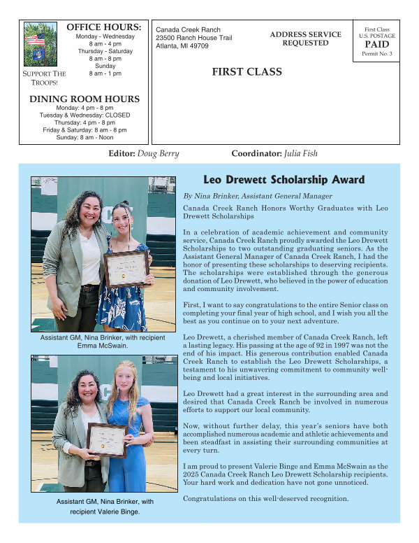 In a celebration of academic achievement and community service, Canada Creek Ranch proudly awarded the Leo Drewett Scholarships to two outstanding graduating seniors. As the Assistant General Manager of Canada Creek Ranch, I had the honor of presenting these scholarships to deserving recipients. The scholarships were established through the generous donation of Leo Drewett, who believed in the power of education and community involvement.