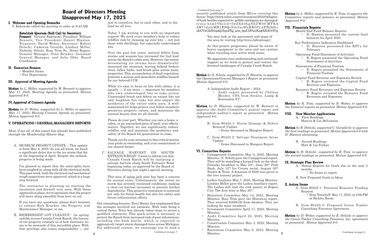 B. MEMBERSHIP LOT CLEANUP- As spring unfolds across Canada Creek Ranch, the beauty of our property reminds us of how fortunate we are to be stewards of this incredible place. With that privilege also comes responsibility— not