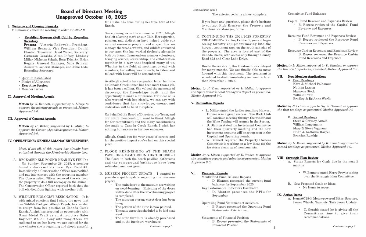 • W. Bennett reported the Property Owners Committee is working on a few ideas for the ice storm clean up of members lots.