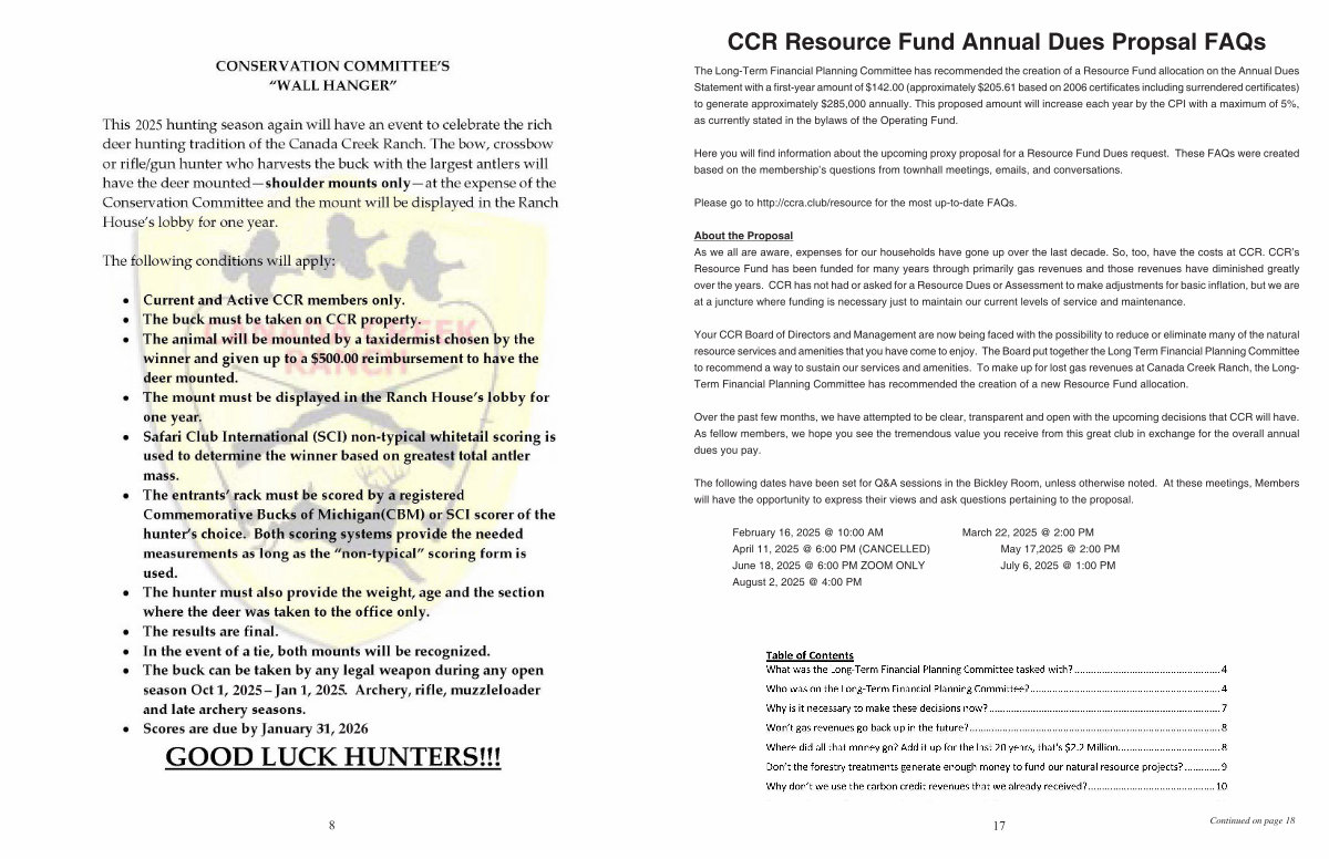 Your CCR Board of Directors and Management are now being faced with the possibility to reduce or eliminate many of the natural resource services and amenities that you have come to enjoy. The Board put together the Long Term Financial Planning Committee to recommend a way to sustain our services and amenities. To make up for lost gas revenues at Canada Creek Ranch, the Long- Term Financial Planning Committee has recommended the creation of a new Resource Fund allocation.